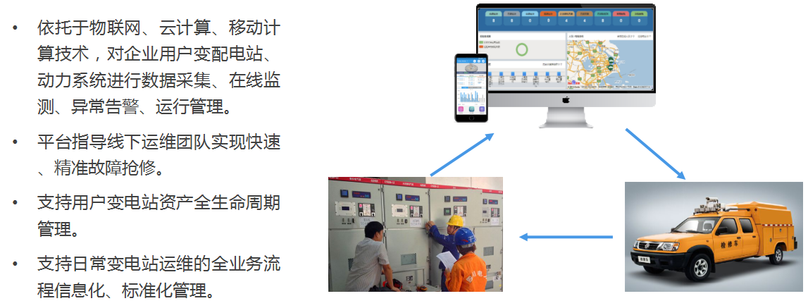 “智能運維”也叫“智能電力運維服務”,是傳統(tǒng)電力運維結(jié)合“互聯(lián)網(wǎng)+”技術以及共享思維而產(chǎn)生的新型電力管理模式,通過線上平臺+線下運維團隊+APP,構建新的運維服務支撐體系,有效提升變電站運行的安全、效率和經(jīng)濟性。